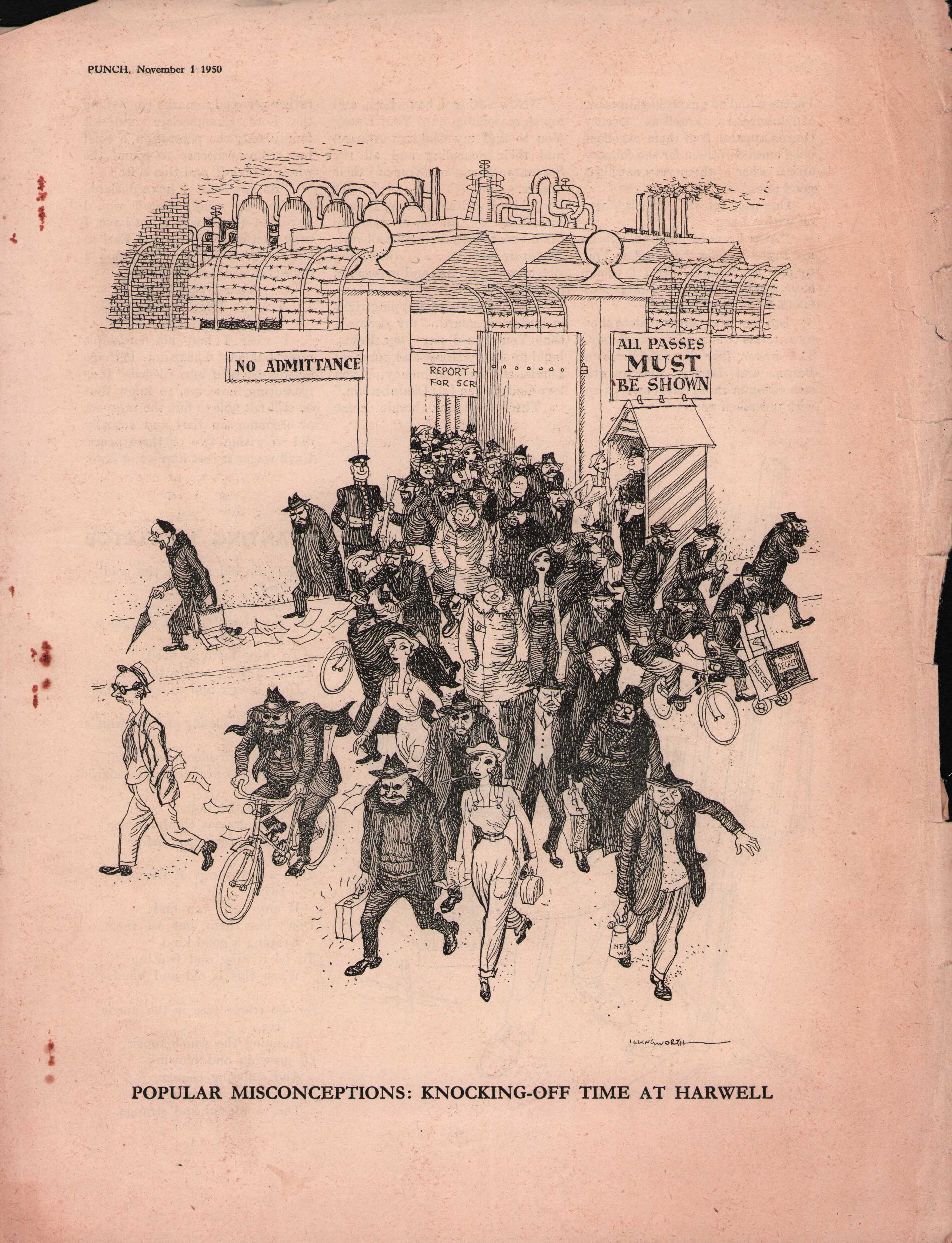 In February 1950, Harwell theoretical physicist Klaus Fuchs was arrested as a spy for passing British atomic secrets to the Soviet Union. In September later that year Bruno Pontecorvo and his family disappeared abruptly, helped by Soviet agents to enter the Soviet Union from Finland. Both betrayals caused public anxiety and suspicion about the Cold War, as well as straining Anglo-American relations over the Manhattan Project. Harwell was understandably horrified and immediately re-evaluated its security protocols and vetting procedures for government and scientific personnel. The cartoon below by Leslie Illingworth was published in Punch on 1st November 1950 as a satirical commentary on the public's perception of Harwell following these arrests.