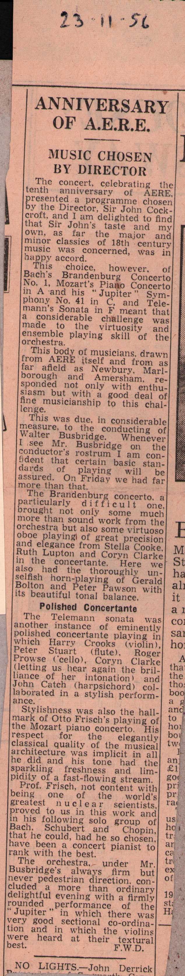 Concert to celebrate the 10th anniversary of AERE on 23 November 1956 with music chosen by the Director; conductor Walter Busbridge with soloist Otto Frisch:
